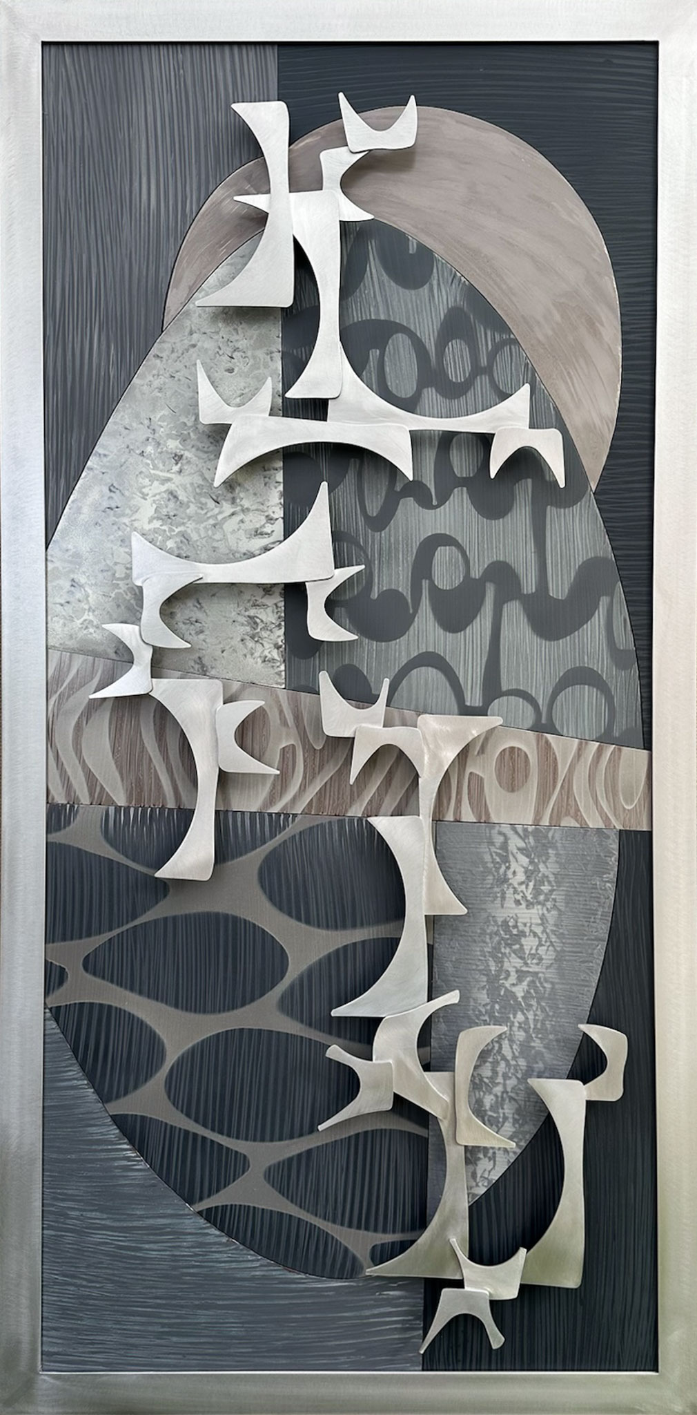 This metal wall sculpture combines organic shapes and elements with abstract patterns and designs.  Muted grayscale colors match a moonscape palette. Welded aluminum shapes provide dimensionality in this mixed media artwork.  This work is approximately 24 inches by 48 inches.