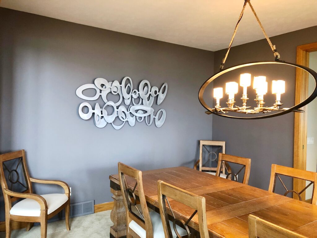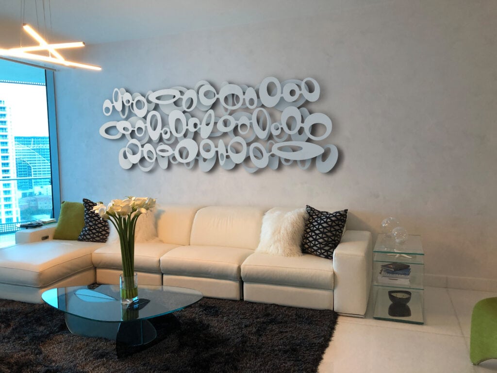 Large Format Metal Wall Sculpture makes a serious statement in your larger space. Powder coated aluminum construction is suitable for outdoor displays. This artwork is approximately 115 inches by 48 inches.