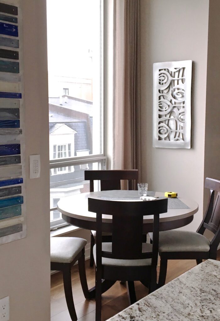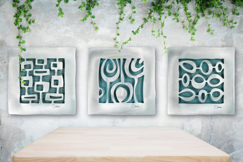 My metal art wall tiles are designed to be modular and interchangeable. You can combine them into larger groupings to customize your art installation. They are suitable for use indoors or outdoors. They are great in any room, even the bathroom! Square tiles are about 14 inches on a side, and the larger rectangular tiles are about 15 inches by 30 inches. They are currently available in red, white, stone gray, sea blue, and ocean blue.