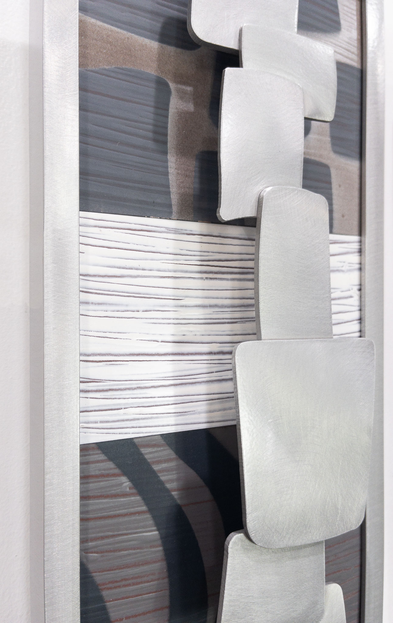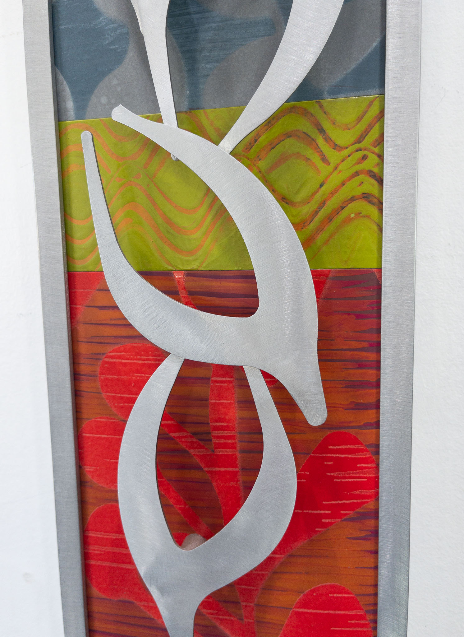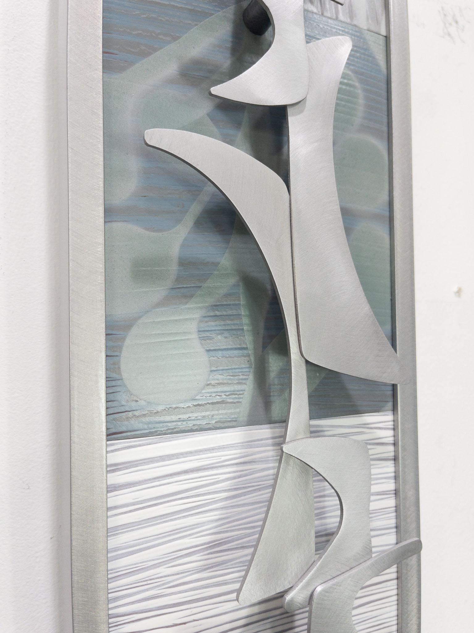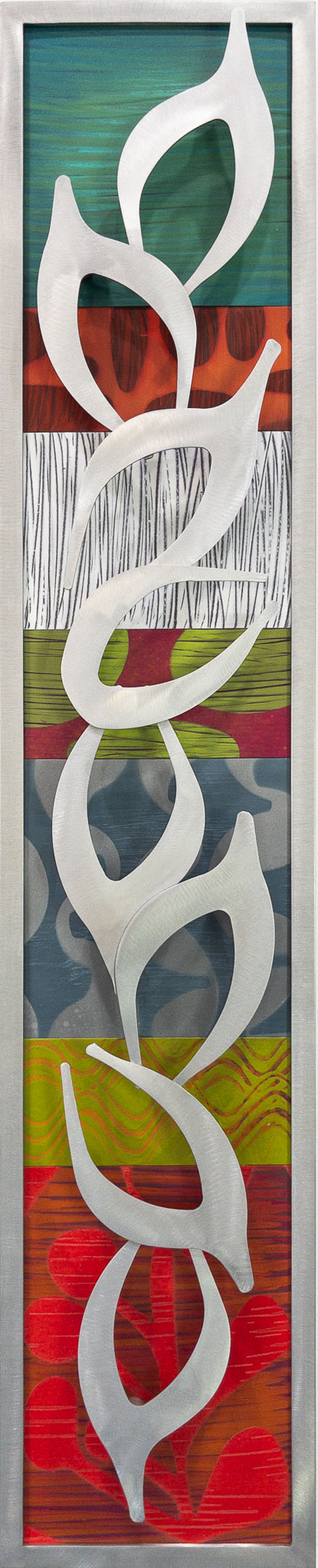 Abstract shape accumulations floating over a background assembled of painted panels. Each piece is approximately 6″ by 32″.