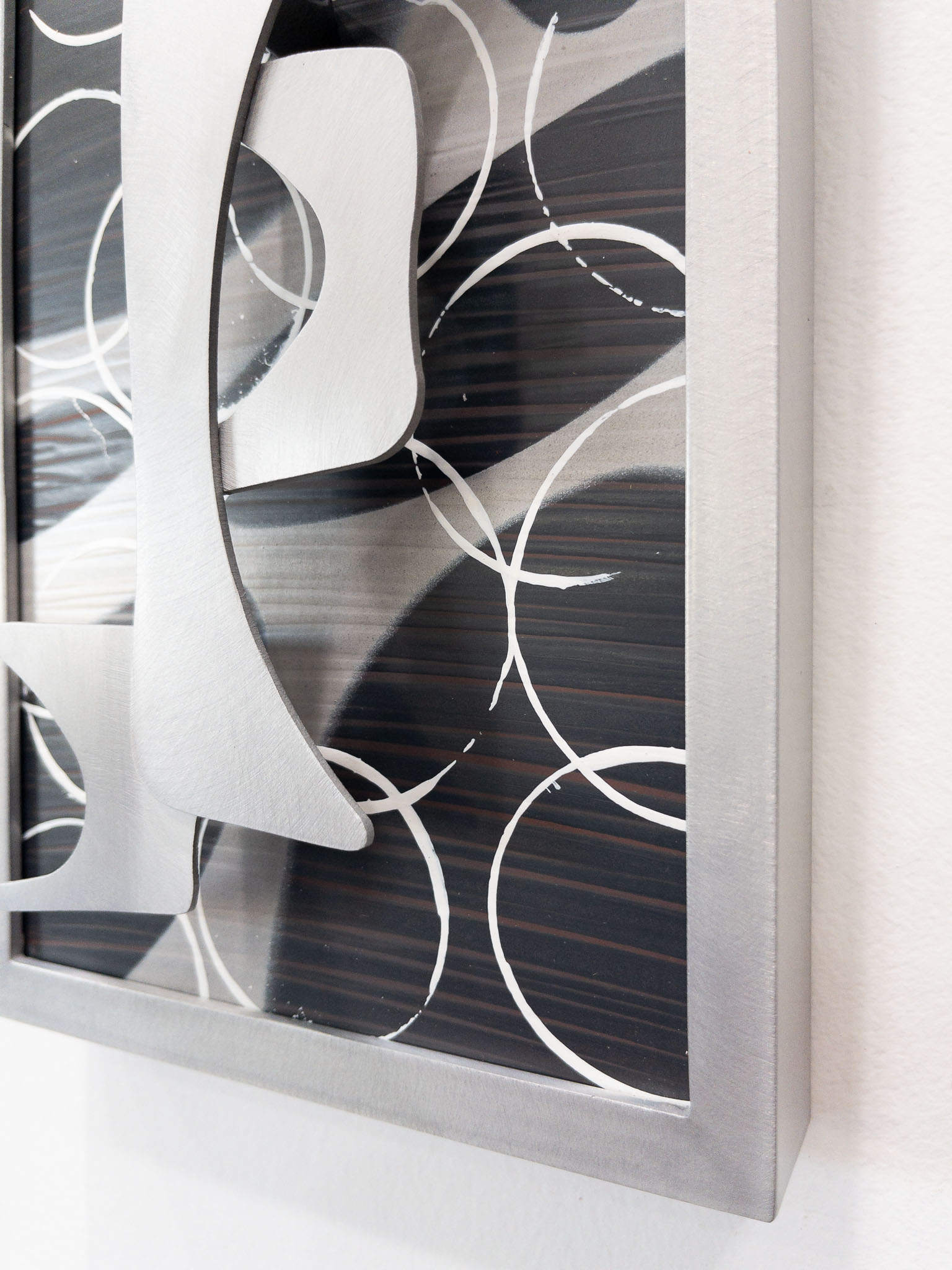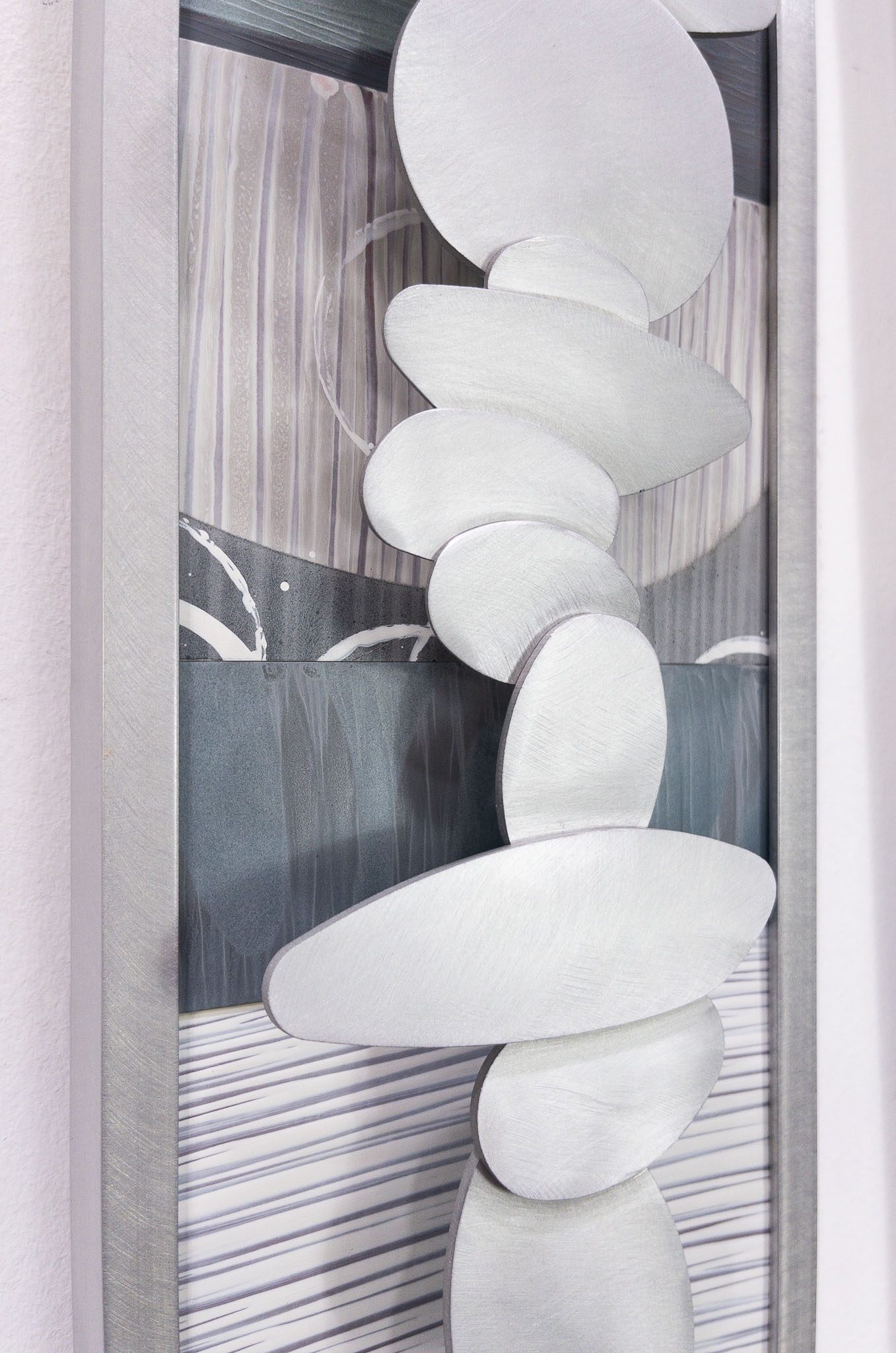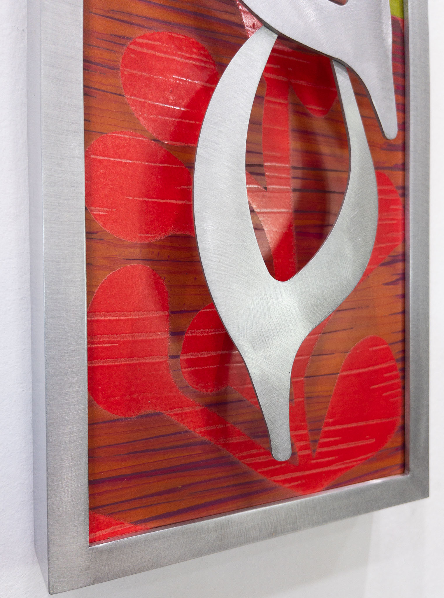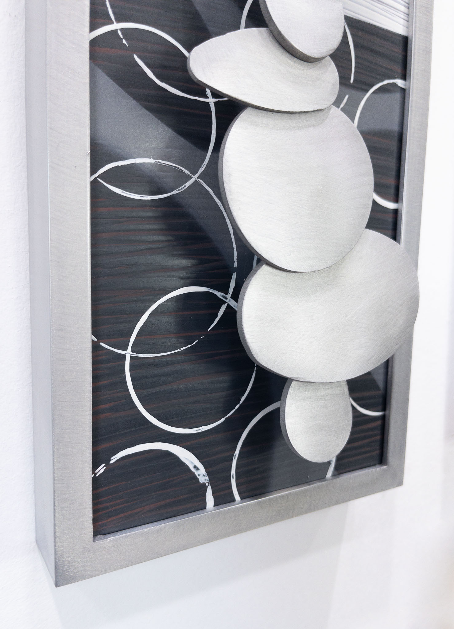 Abstract shape accumulations floating over a background assembled of painted panels. Each piece is approximately 6″ by 32″.