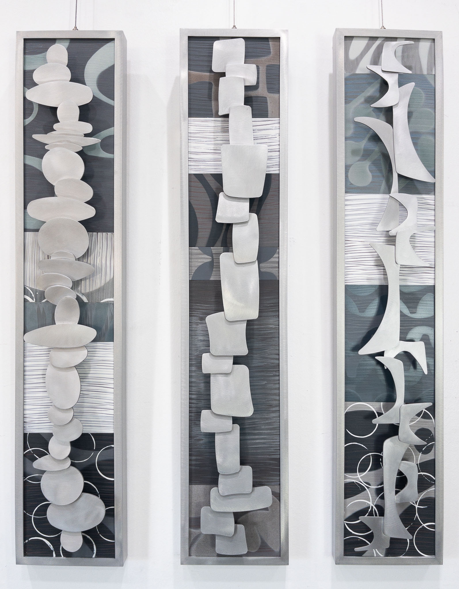 The pieces offered here are unique. They are available individually or as a set of three. Three pieces can be hung in a row, as shown, or staggered diagonally for a different effect.